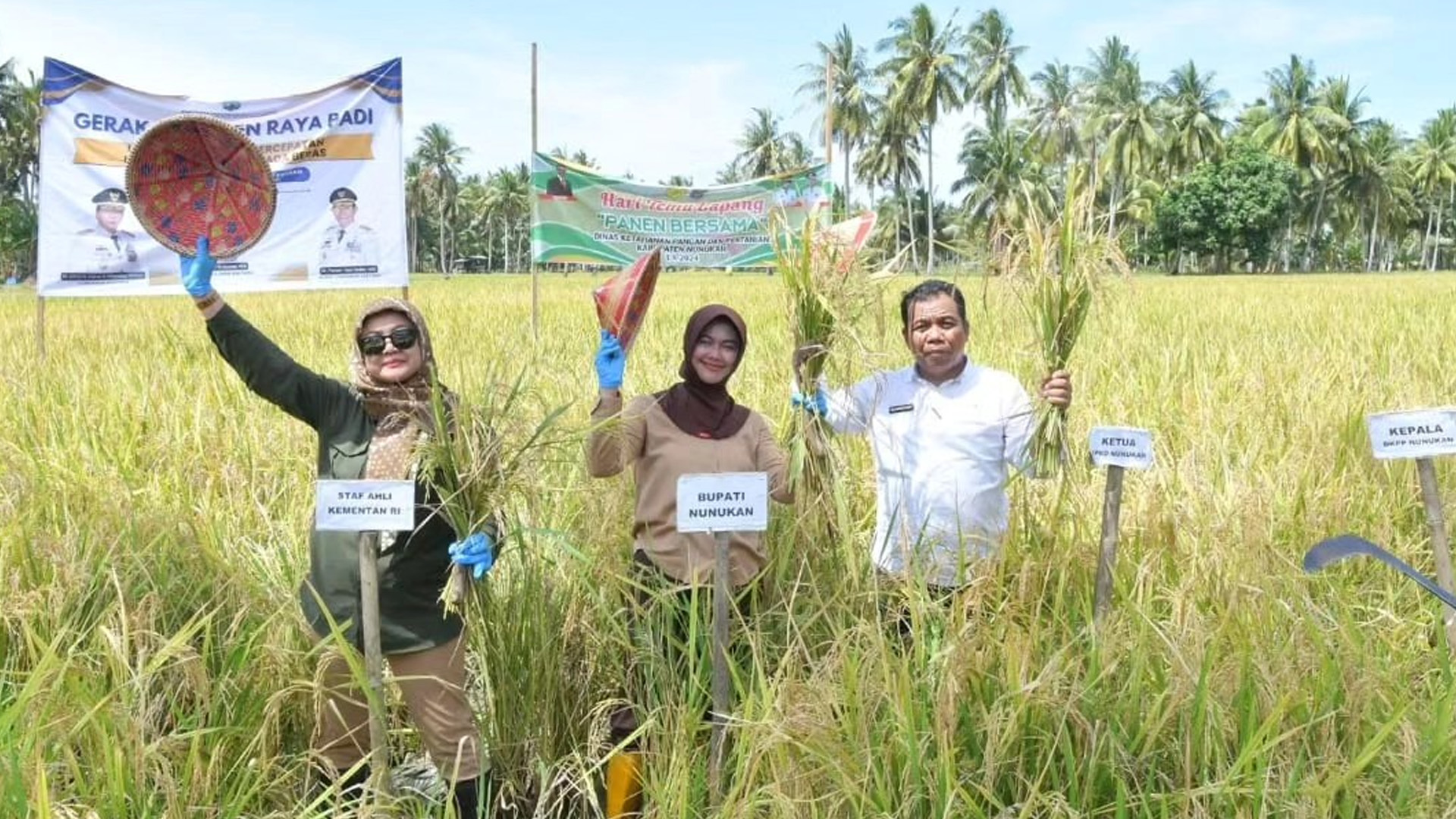 Bupati Nunukan Hj Asmin Laura Hafid bersama Staf Ahli Kementerian Pertanian dan Ketahanan Pangan ( Kementan ) Republik Indonesia Pamuji Lestari melakukan Panen Raya bersama masyarakat di hamparan sawah kelompok tani Mamminasae Kecamatan Sebatik Timur, Minggu 18 Agustus 2024.